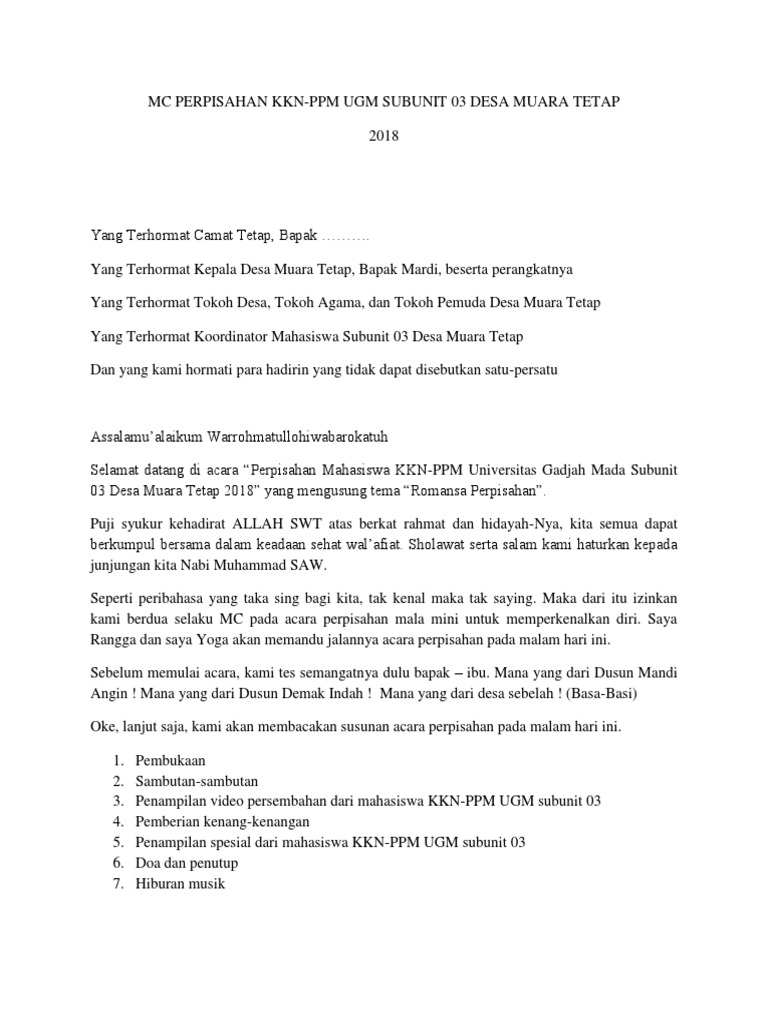 Disini kami berdua, selaku pembawa acara, perkenankanlah kami, untuk membacakan susunan acara yang akan berlangsung pada siang hari ini. Dan kata sambutan menjadi hal yang tak pernah dilewatkan dalam berbagai kesempatan. Nah dalam praktek kkn, saat baru datang dan saat selesai masa tugas kkn, mahasiswa akan disambut dan dilepas oleh pejabat setempat dan masyarakat. Salah satunya adalah acara perpisahan saat masa kkn usai. Apr 05, 2018 · yang kami hormati bapak.