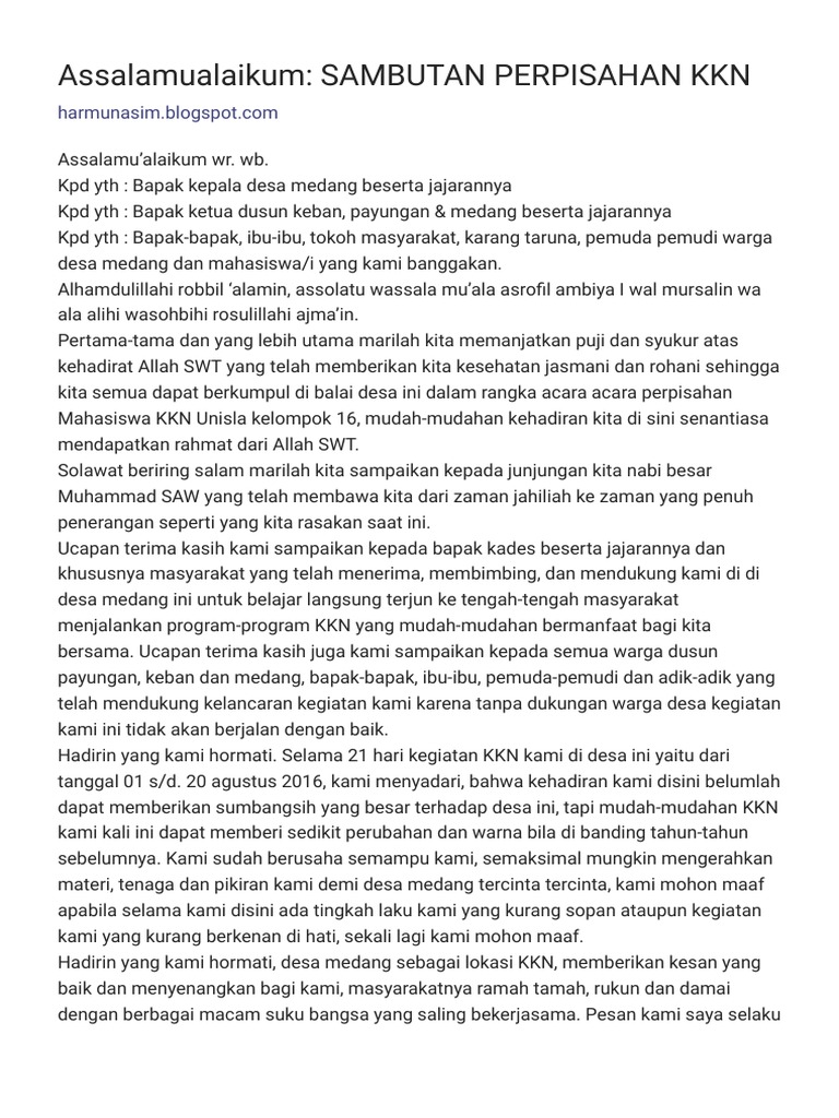 Feb 14, 2013 · pidato singkat perpisahan dengan mahasiswa kkn di desa. More images for sambutan camat perpisahan kkn » Oleh bapak asisten ii bid. Salah satunya adalah acara perpisahan saat masa kkn usai. May 10, 2020 · pidato sambutan pelepasan penerimaan kkn kuliah kerja nyata.